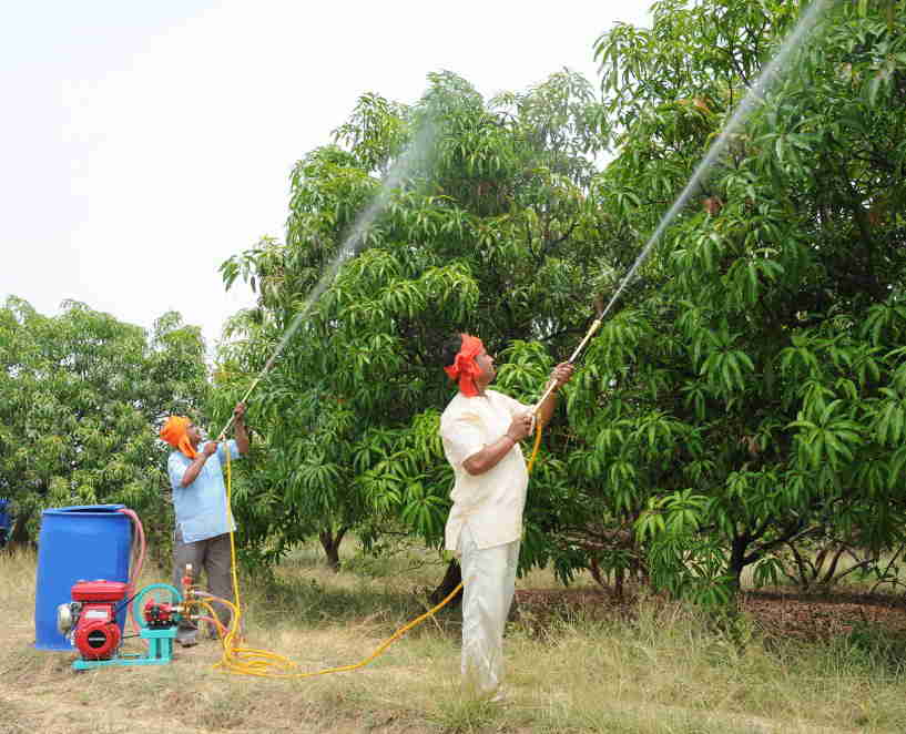 As mango tree once grown has very limited infection from pest & disease. We use neem oil, neem cake, castor cake & Jivamrut and different plant leaves extract to control termite and other diseases. We also follow up multiple inter cultivation and physical and bio control techniques for better control with permissible and limited formulas available time to time